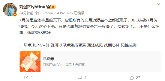 刘煜辉分析,7月的市场呈现出趋势容量占据主导的特征,几乎吸纳了所有交易资源,这是指数在7月表现强劲的主因。然而,今日市场出现下杀,这标志着趋势容量行情告一段落,市场将迎来新的变化。但他同时强调,这并非坏事,投资者应积极适应市场变化。